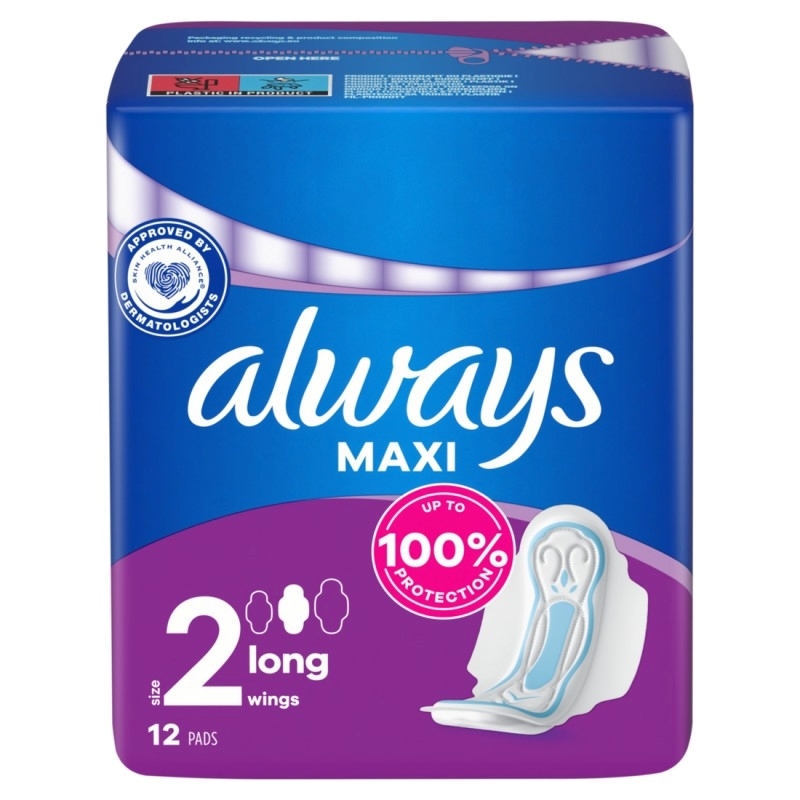 Σερβιέτες με φτερά Maxi Long από την εταιρεία Always, κατασκευασμένες από απορροφητικό υλικό ώστε να προσφέρουν ασφάλεια κατά τις δύσκολες μέρες της περιόδου.