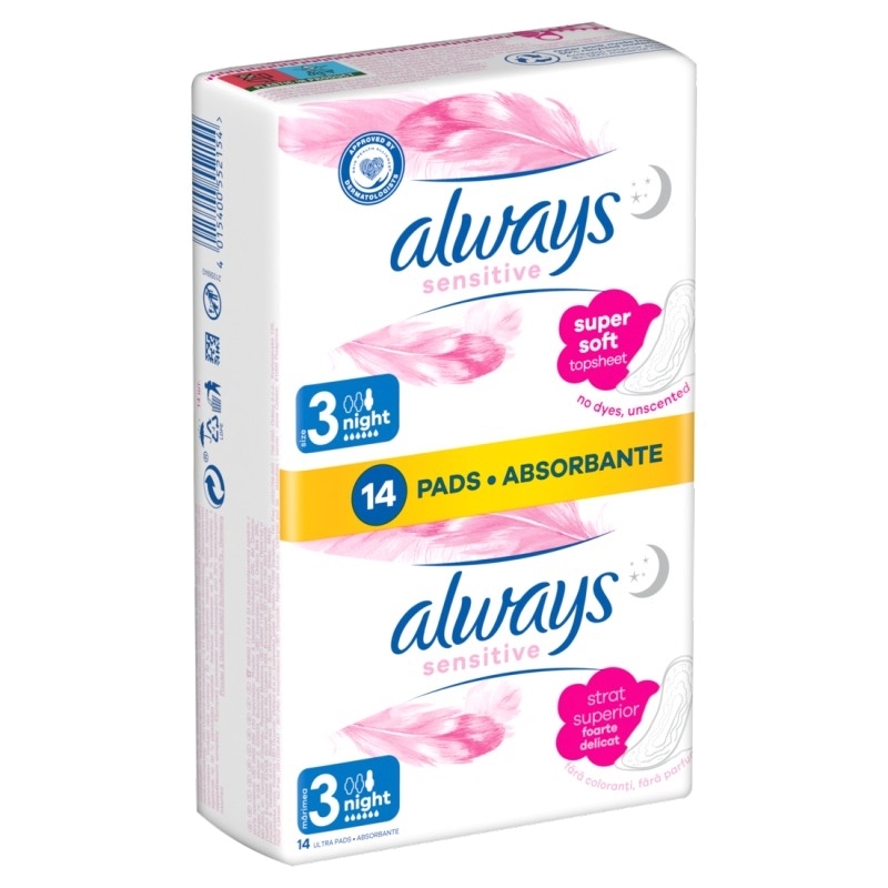Always Ultra Sensitive Night Σερβιέτες Μέγεθος 3 Εξαιρετικά απαλό κάλυμμα και μοναδικές ζώνες άνεσης που εξασφαλίζουν επιπλέον προστασία στην ευαίσθητη επιδερμίδα. Ιδανική για τις μέρες και νύχτες με μεσαία ροή. Με φτερά που παρέχουν επιπλέον προστασία στα πλαϊνά και βοηθούν τη σερβιέτα να παραμένει στη θέση της. Οι σερβιέτες με φτερά Always Ultra Sensitive Night(Μέγεθος 3) είναι η καλύτερη επιλογή της Always Sensitive για τις μέρες και νύχτες με μεσαία ροή. Οι σερβιέτες Always Sensitive είναι 2 φορές πιο μαλακές και ευέλικτες (σε σχέση με την Always Ultra) Υπεραπορροφητικός πυρήνας με τζελ που κλειδώνει τα υγρά Πολύ λεπτή σερβιέτα για άνεση και διακριτικότητα Με φτερά για να κρατούν τη σερβιέτα στη θέση της και να προστατεύουν από διαρροές Σερβιέτες δερματολογικά ελεγμένες ότι είναι απαλές με την επιδερμίδα