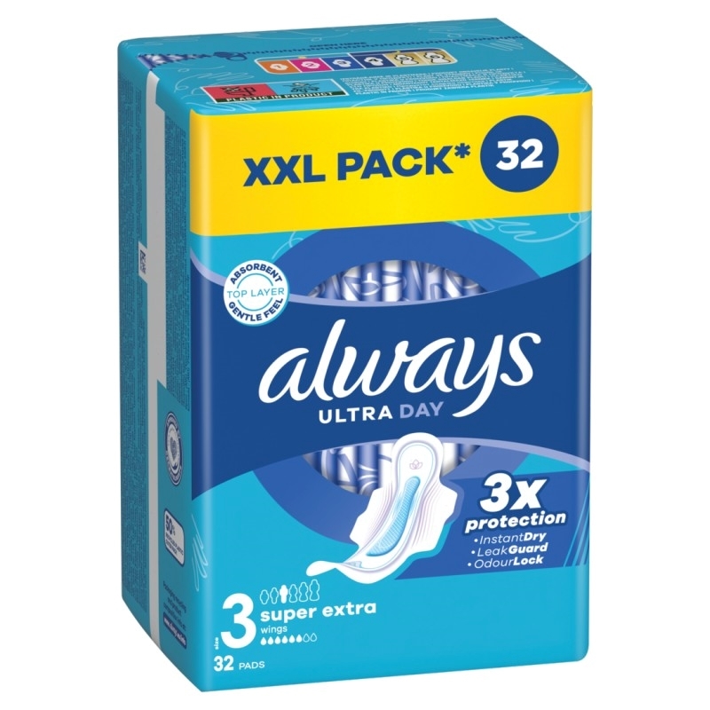 Μην συμβιβάζεστε με λιγότερο από 3x προστασία με τις σερβιέτες ALWAYS Ultra Super Extra (Μέγεθος 3). Οι σερβιέτες Always με το απορροφητικό και απαλό στην αίσθηση επάνω στρώμα απορροφούν σε δευτερόλεπτα χάρη στην τεχνολογία InstantDry; και αποτρέπουν οσμές και διαρροές χάρη στις τεχνολογίες φράγμα LeakGuard και OdorLock. Τα μοναδικά ComfortLock φτερά τους έχουν σχεδιαστεί για τέλεια εφαρμογή σε κάθε είδος εσωρούχου. Για έξτρα προστασία τη νύχτα; δοκιμάστε τα μεγέθη της Always Night. Οι σερβιέτες Always Ultra είναι δερματολογικά εγκεκριμένες από τη Skin Health Alliance.