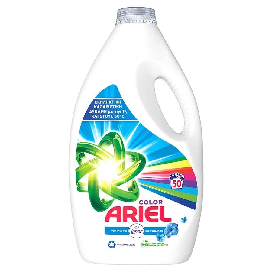 Το υγρό απορρυπαντικό Ariel Touch of Lenor Color προσφέρει εκπληκτική καθαριότητα από την 1η πλύση, ακόμη και στους 30°C. Η σύνθεσή του σχεδιάστηκε ειδικά για πλύσιμο σε κρύο νερό, και συμπεριλαμβανει την τεχνολογία COLD BOOST. Επίσης, το υγρό απορρυπαντικό Ariel διατηρεί ζωηρά τα χρώματα για μεγαλύτερο χρονικό διάστημα και βοηθά στην πρόληψη της απώλειας χρώματος, ενώ χαρίζει στα ρούχα σας τη φρεσκάδα του Lenor που διαρκεί. Επιπλέον, το υγρό απορρυπαντικό Ariel διατίθεται σε 100% ανακυκλώσιμη συσκευασία. Μπορείτε, επίσης, να χρησιμοποιήσετε το υγρό απορρυπαντικό Ariel Touch of Lenor Color μαζί με το πράσινο καπάκι, για να προετοιμάσετε τους λεκέδες. Στη συνέχεια, τοποθετήστε τα ρούχα σας στο πλυντήριο. Για καλύτερα αποτελέσματα, τοποθετήστε το καπάκι δοσολογίας με το απορρυπαντικό ρούχων κατευθείαν στον κάδο του πλυντηρίου. Για περιβαλλοντικούς λόγους, δεν διαθέτουμε σε όλα τα μπουκάλια μας καπάκι δοσολογίας, αλλά είναι διαθέσιμο δωρεάν στον ιστότοπο ariel.info.