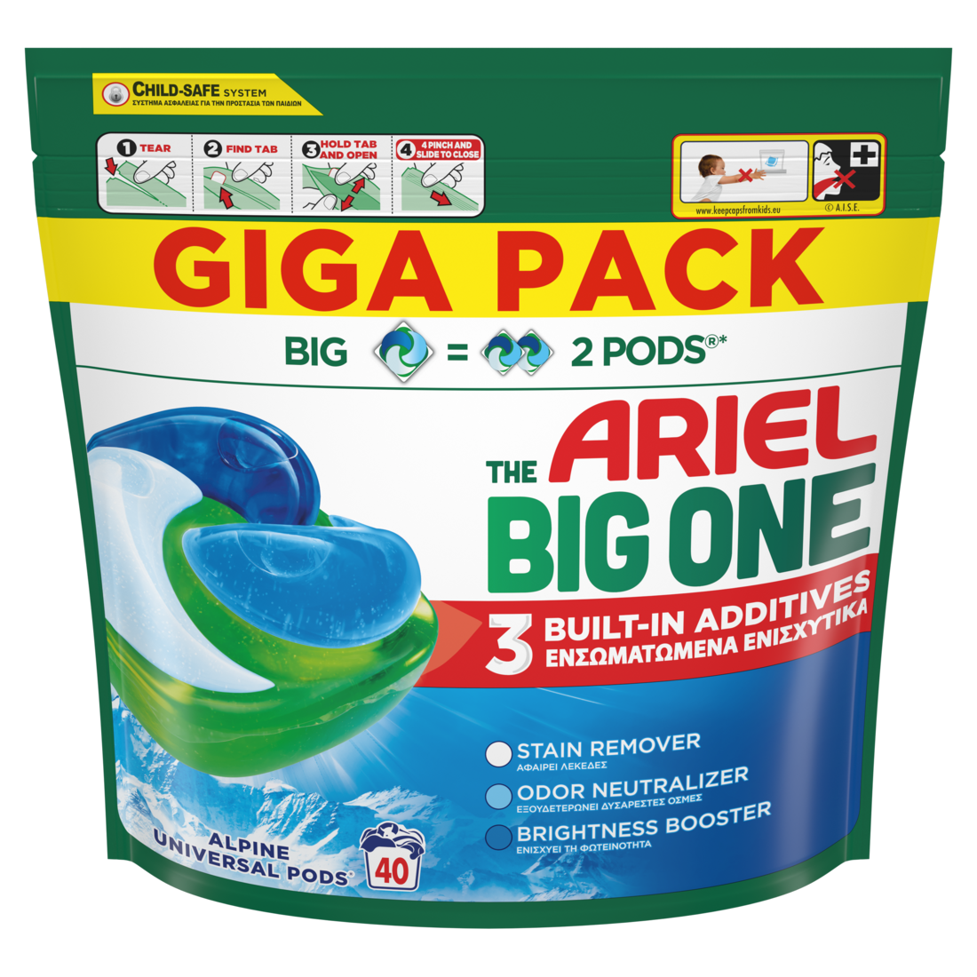 Ανακαλύψτε τις κάψουλες πλυντηρίου Ariel The BIG ONE PODS Αlpine, με 2Χ καθαριστική δύναμη (η απόδοση του Ariel The BIG ONE ισοδυναμεί με 2 κάψουλες Ariel Alpine PODS). Παρέχουν τη μέγιστη καθαριότητα Ariel με ελάχιστη προσπάθεια: με 3 ενσωματωμένα πρόσθετα για εξουδετέρωση δυσάρεστων οσμών, ενίσχυση φωτεινότητας και άψογη αφαίρεση λεκέδων. Επιπλέον, έχουν σχεδιαστεί για να λειτουργούν τέλεια ακόμα και σε χαμηλότερες θερμοκρασίες, διαλύονται γρήγορα ακόμα και σε κρύο νερό και παρέχουν άψογα αποτελέσματα. Χαμηλώστε τη θερμοκρασία πλύσης και εξοικονομήστε έως 60% στον λογαριασμό ηλεκτρικού ρεύματος του πλυντηρίου σας (ενεργειακή κατανάλωση πλυντηρίου από 60°C σε 30°C, κανονικός κύκλος). Για καλύτερα αποτελέσματα, τοποθετήστε τη κάψουλα πρώτα στο πίσω μέρος του κάδου και από πάνω τα ρούχα. Κρατήστε πάντα τις κάψουλες Ariel μακριά από τα παιδιά. Επισκεφθείτε το keepcapsfromkids.eu για περισσότερες πληροφορίες.
